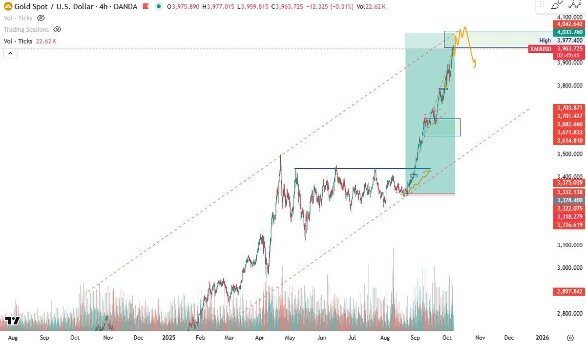 В ответ на пост Золото. Очень быстро, как и ожидал в торговом плане, доехали до финальной целевой зоны 3960-4040. Одно из самых мощных и быстрых движений года. Надеюсь, многие смогли в нем принять участие. С конца августа драгоценности подорожали на 20% и выдали 700$ движения на контракт.