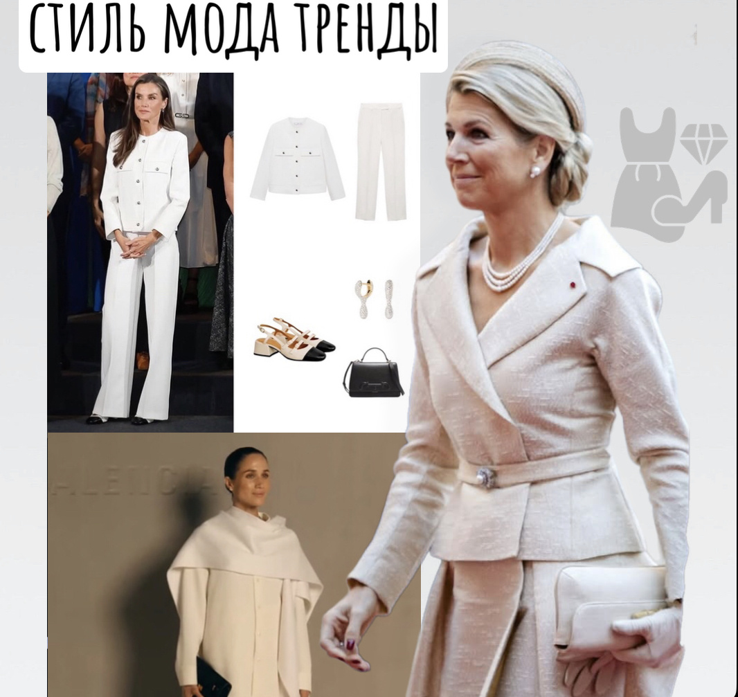 Итак, сегодня мы видим довольно странный для осени тренд на светлое, часто полностью белое. И начну я с неутомимой Максимы в ее поездке по югу Франции. Да, великолепный жемчужный! Тренд поддерживают все королевские особы . Вот испанская королева Летиция. В белоснежном. На официальное мероприятие Ее Величество выбрала белый комплект от демократичного Mango. А вот и заседание в Вене. Дамы в белом. Королева Бельгии в бело-лимонном цвета сорбе. От Natan couture. Принцесса Люксембургская Клэр на службе по поводу коронации нового правителя, Великого герцога Гийома. Чисто белый видим на не к ночи будь упомянутой герцогине Токсичность Сассекской. Из новой коллекции Balenciaga. Ну и очень эффектно выглядит королева Иордании. На Рании комплект от Max Mara и тоже белый. Нотка уточенной женственности в акценте на талию и банте! Конечно, они не едут под дождем с детьми в переполненном трамвае и не добираются в пригородной электричке на работу. Но выглядит эффектно! И подсвечивает ли
