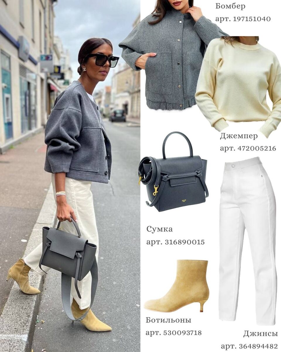 Этот образ — про баланс. Прямые джинсы, мягкий свитер и бомбер создают расслабленный, но при этом собранный look. Лаконичные ботильоны добавляют женственности, а структурированная сумка завершает образ. Я люблю, что в нём есть всё нужное для города: удобство, уверенность и чуть-чуть дерзости. Если хотите добавить акцента — попробуйте солнцезащитные очки или яркий шарф.