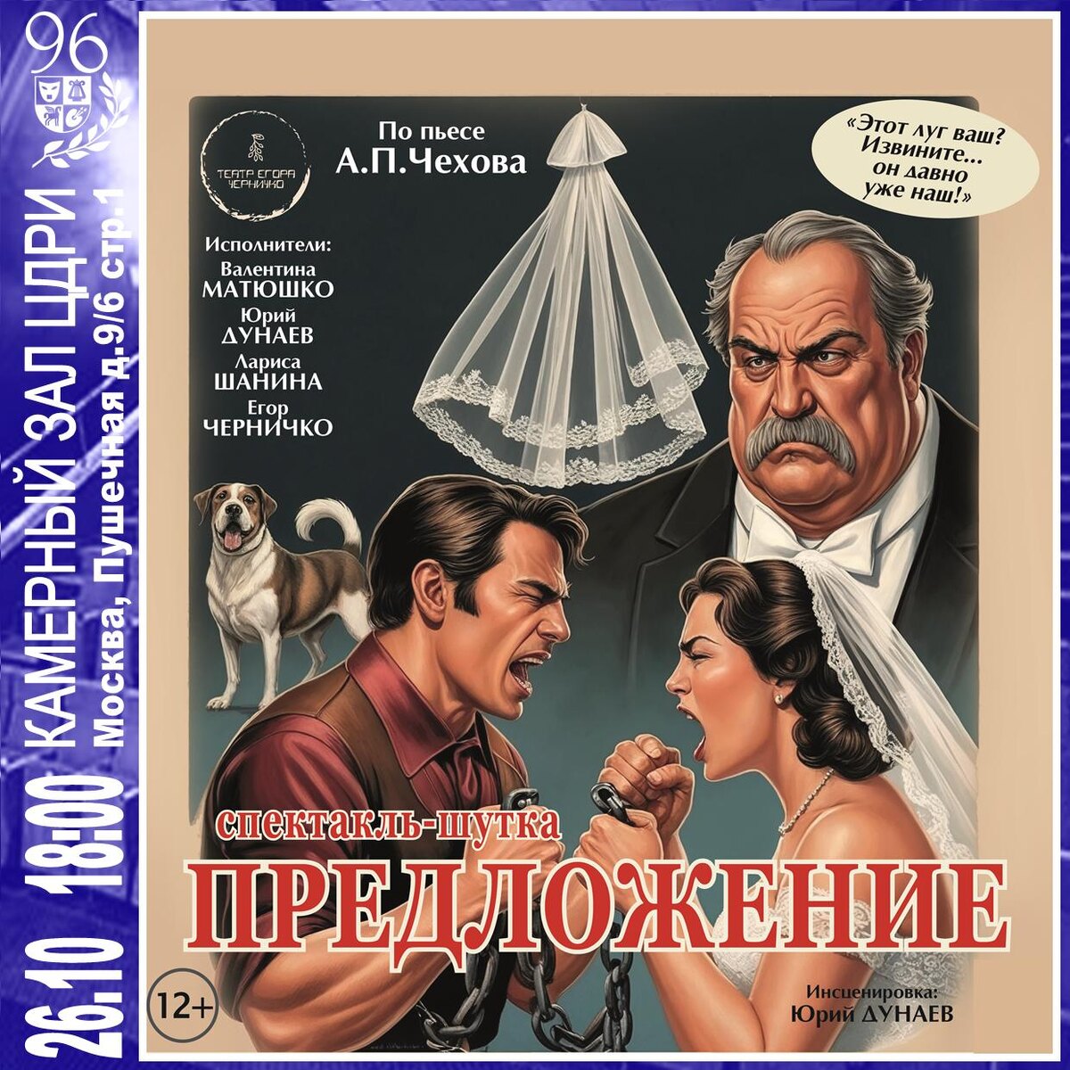 Тот самый водевиль, который смешит 130 лет. Забудьте о скучном сватовстве! Приготовьтесь к вихрю абсурда, истерик и... неожиданной свадьбы! Спектакль начинается с исторического курьеза: молодой франт Валентин Передеркин в парадном фраке и лакированных ботинках является к очаровательной княжне Вере Запискиной, чьи «шелковые волнистые кудри способны разбить любой камень». В атмосфере томных взглядов и трепетного волнения он делает ей... предложение .... (Рассказ «Предложение», 1886). Но это лишь пролог к настоящему хаосу! Действие стремительно переносится в мир знаменитого чеховского водевиля, где сосед Иван Васильевич Ломов, страдающий от сердцебиения и страха перед женитьбой, решается сделать предложение дочери помещика Чубукова — Наталье Степановне. Казалось бы, дело решенное... Однако пустяковый спор о клочке земли — Воловьих Лужках — мгновенно перерастает в эпическую битву! Безумные перепалки, визуал