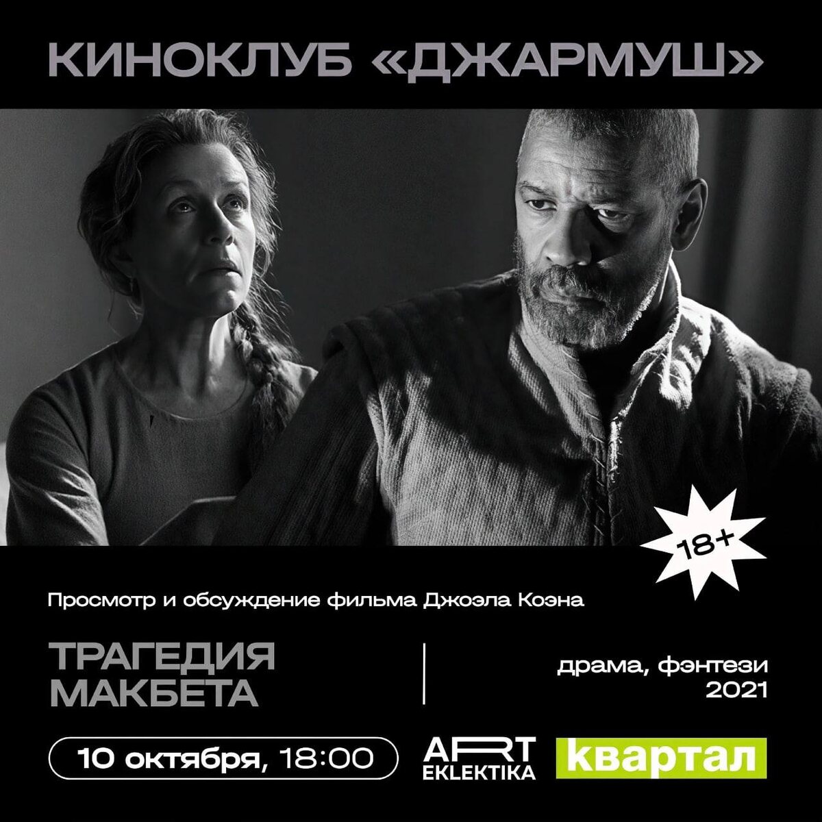 Просмотр и обсуждение фильма Джоэла Коэна «Трагедия Макбета» в киноклубе «ДЖАРМУШ» | 18+ 🗓️ 10 октября 18:00 📍Квартал, Ленина 78 «Трагедия Макбета» — американский художественный фильм 2021 года, снятый Джоэлом Коэном по собственному сценарию на основе трагедии «Макбет» Уильяма Шекспира. Три ведьмы предсказывают высокопоставленному шотландскому дворянину лорду Макбету восхождение на трон. Он планирует узурпировать королевскую власть любой ценой. Фильм получил три номинации на премию «Оскар»: Лучшая мужская роль, Лучшая операторская работа, Лучшая работа художника-постановщика и множество других международных наград. Ведущий киноклуба: Павел Солдатов. Вход свободный 🏷️ #10октября25@culturnik