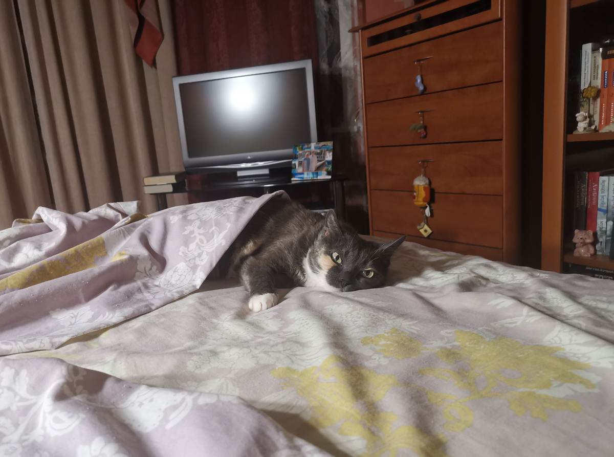 За время нашего общения с Фросюшей, выработалось немало традиций. К примеру, каждый вечер придя после работы, мне было необходимо полежать с ней на кровати и погладить кошке пузико. Она терпеливо ждала, а в случае затянувшегося ужина на кухне или необходимости срочной внеплановой работы за компьютером, недвусмысленно намекала, что пора идти на сеанс почесушек. Как она это делала? Своим требовательным или вопрошающим взглядом и общим поведением. А если, к примеру, после ужина я шёл в ванную комнату с целью побриться, то сопровождала меня и сидя рядом в позе "буханочки", проявляла образец терпения, но при этом недвусмысленно намекала на необходимость ускорения процесса бритья.