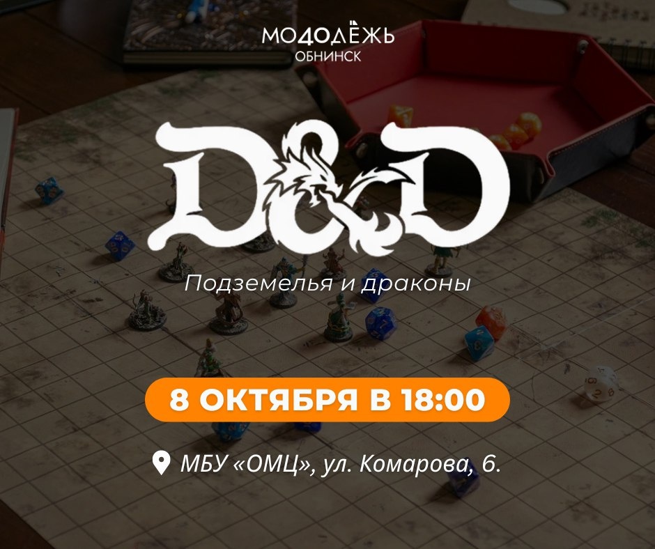 🎲 «Подземелья и драконы» в ОМЦ! Покоряй подземелья, сражайся с чудовищами и заводи новых друзей в атмосфере эпических приключений. Присоединяйся и окунись в увлекательный мир настольно-ролевых игр — каждую среду в 18:00! 📍 Место: МБУ "ОМЦ", ул. Комарова, 6. Вход с правого торца здания (красная дверь). Ждем тебя и твоих друзей! ❗ Возрастное ограничение: 14+ Подписаться | Ваша реклама