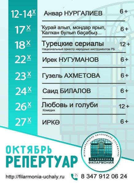 Обновили для Вас репертуар на октябрь, сохраняйте себе, чтобы не потерять 12-14.10 Анвар НУРГАЛИЕВ vk.com/wall-77320751_29761 17.10 «Ҡурай алып, моңдар ярып, Ҡалҡан булып баҫабыҙ…» vk.com/wall-77320751_29965 18.10 Турецкие сериалы vk.com/wall-77320751_29705 22.10 Ирек НУГУМАНОВ vk.com/wall-77320751_30019 23.10 Гузель АХМЕТОВА vk.com/wall-77320751_30039 24.10 Саид БИЛАЛОВ vk.com/wall-77320751_29968 26.10 Любовь и голуби vk.com/wall-77320751_29671 27.10 ИРКӘ vk.com/wall-77320751_29813 ___________________ Билеты в продаже в кассе филармонии Касса работает в будние дни с 10:00 до 19:00, перерыв 14:00-15:00 Телефон для справок 8 347 912-06-24 ___________________ В репертуаре возможны изменения, пост будет обновляться. Пожалуйста, о наличии билетов узнавайте по 8 347 912-06-24 Источник https://uchaly102.ru/?p=104236