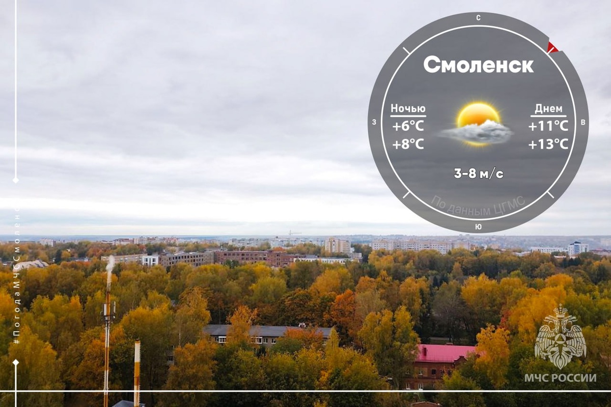 в Смоленске: ночью +6…+8°C, днём +11…+13°C.