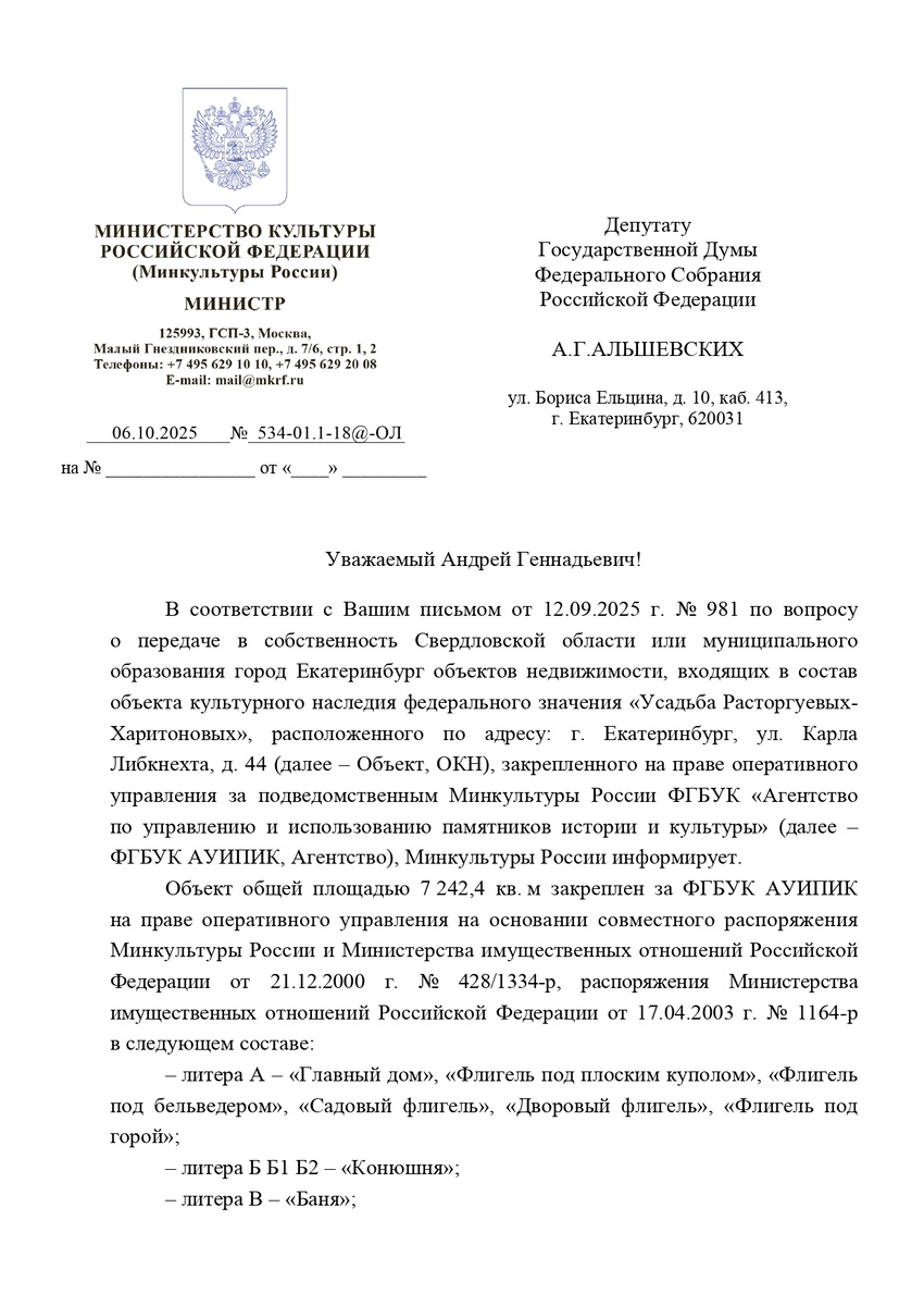 Здание – федеральная собственность, и оно достаточно давно находится в ненадлежащем состоянии. Невозможно беспечно смотреть на разруху. И город, и область готовы вложиться в ремонт, однако прежде всего надо забрать знаковый объект на свой баланс. Несколько лет назад я обозначал инициативу перед Минкультом, однако ведомство высказалось отрицательно. В сентябре обратился с новым ходатайством. И министр Ольга Любимова уже отреагировала не так категорично. Она готова рассмотреть возможность обмена усадьбы на равноценную недвижимость. Передам информацию главе региона и мэру, чтобы продолжить конструктивный диалог с Минкультуры.