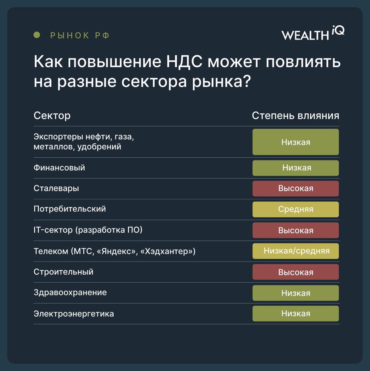 📈Слово из трех букв: НДС могут повысить в следующем году — как это может повлиять на фондовый рынок? 💬Александр Алексеевский, инвестиционный аналитик Wealth IQ, CFA С 2026 года ожидается ряд изменений в налоговом законодательстве, в первую очередь повышение НДС до 22% с текущих 20%. В целом значительного эффекта на весь рынок акций повышение налогов оказать не должно. Тем не менее мы оценили, какие сектора все же будут более чувствительны к новым налоговым ставкам. 🔘Кто пострадает меньше всех? Минимальным образом повышение затронет сектор здравоохранения — медицинские услуги не облагаются НДС. Однако косвенный негативный эффект все же будет, потому что повышение НДС снизит покупательную способность населения. Слабый негативный эффект ожидается и в финансовом секторе, так как банковские услуги тоже не подлежат обложению НДС, но некоторые из них (обслуживание банковских карт, процессинг и эквайринг), видимо, начнут им облагать с 2026 года. На экспортоориентированные компании эфф