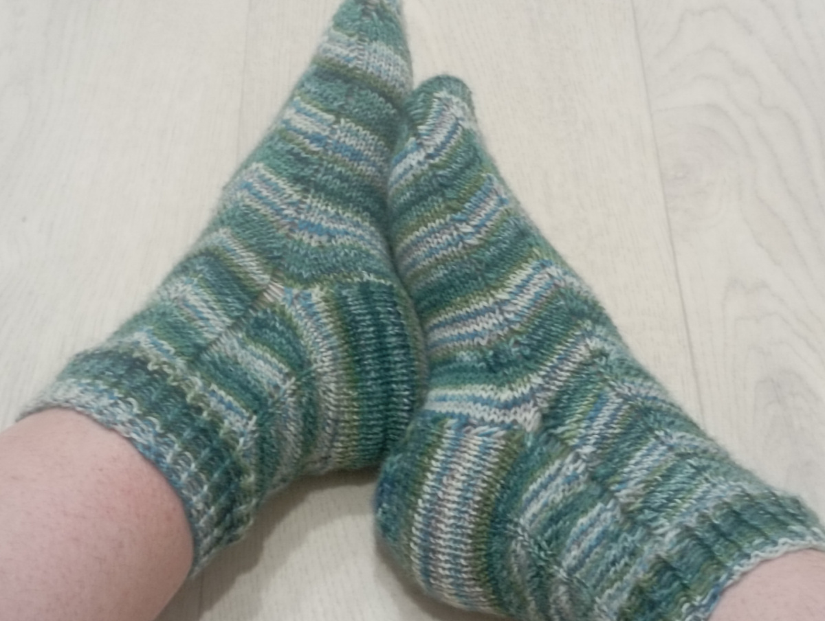 Из той же пряжи в полоску, но с добавлением на резинку, пятку и мысок однотонной голубой пряжи свяжу такие носки ещё раз, учитывая недостатки и просчеты.