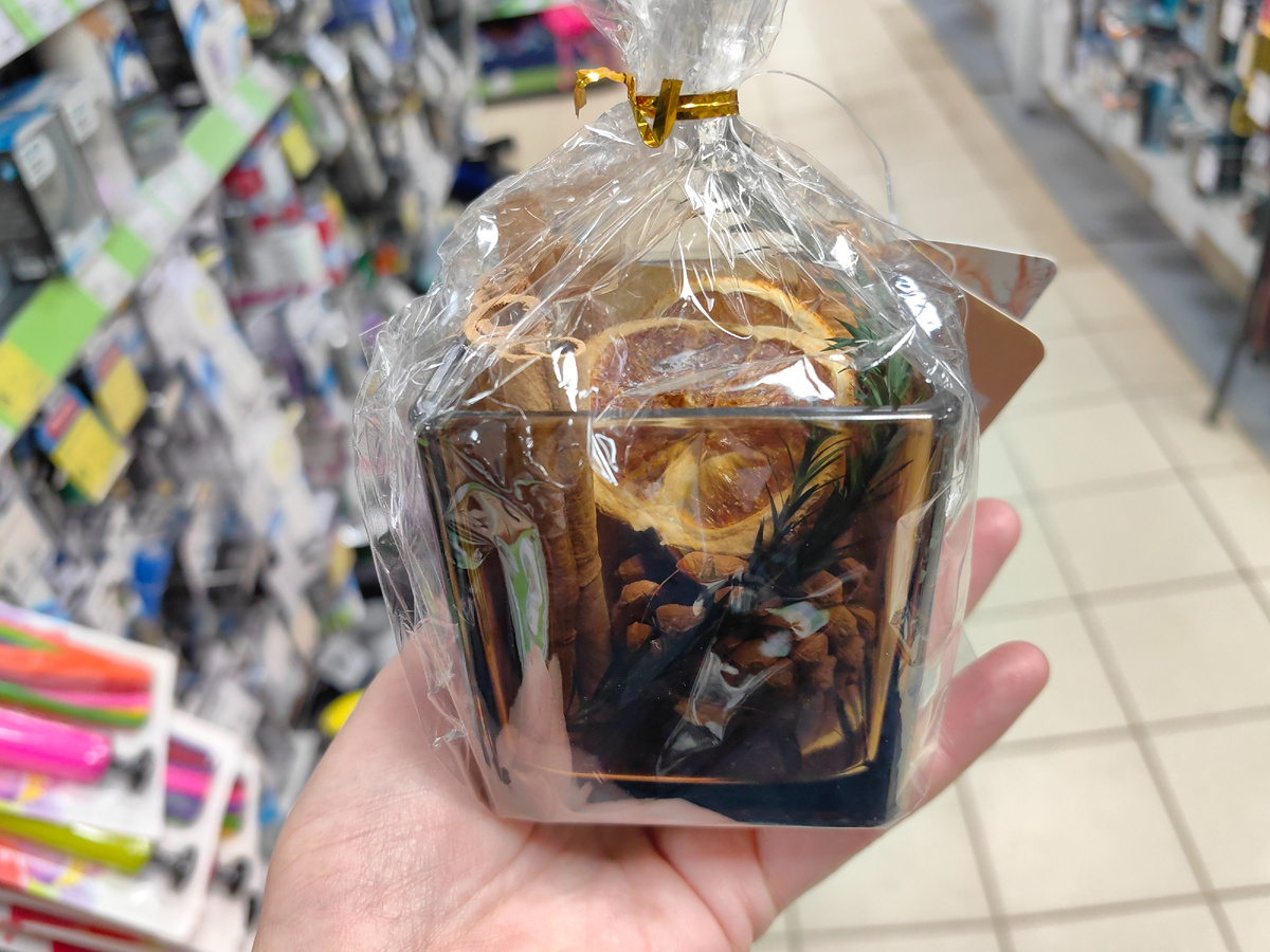 В Фикс Прайс опять новинки, как одиночные, так и в разных коллекциях. Смотрите, в стеклянном стакане рядом с высушенными дольками апельсина лежат сосновые шишки. Для чего? Это одна из новогодних новинок? По идее, да, можно и для зимней композиции, можно и сейчас использовать. Для тонкого осеннего аромата, для уюта в комнате. Рассмотрела, кроме шишек еще веточка чайного дерева и корица. В этом стакане даже две веточки, аромат насыщеннее. Композиция Вдохновение. Наполнение схоже, цвет стакана (вазочки) разный: темное стекло, прозрачное или, как на фото ниже, оранжевое, ярче, как осенние листья. Композиция за 229р. Чуть ниже на витрине желуди. Белые, с серебристыми (зеркальными) шляпками. Тоже для декора? На этот раз вложена и практичная задумка. Это банка такая, вернее, шкатулка. Крышечка может быть золотистой. Тогда смело можно будет добавить к золотистой металлической коллекции лета (подносы со вставками зеркала, фигурки, подсвечники). Шкатулка керамическая, небольшая, по выс