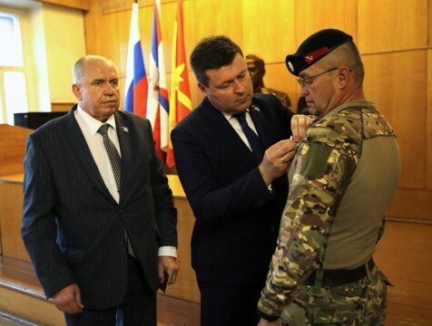 Председатель думы городского округа Калуги Юрий Моисеев и депутат, военный комиссар Калуги Андрей Иванов вручили медаль "За храбрость" II степени участнику специальной военной операции Юрию Владимировичу Буднику.