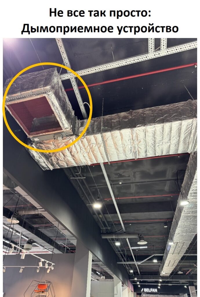 «Что за вопрос? Решетка, она и есть решетка». На самом деле не все так просто. Давайте рассмотрим детали этого фото, может найдется что-то новое и для вас. Решетка Вместо решеток, которые используются в общеобменной вентиляции, в дымоудалении часто применяются сетки. Они отличаются большой площадью живого сечения, что облегчает удаление дыма. Если сводное пространство для движения воздуха в традиционной вентиляционной решетке составляет лишь 50-60% от ее площади, то у такой сетки оно достигает 85%. Иногда вообще обходятся без решеток и сеток, но это не придает системе завершенный вид. Воздуховод Обратите внимание, что воздуховод за сеткой имеет рыжий оттенок. Это грунтовка, которую используют для покрытия листов из «черной стали». Как известно, воздуховоды общеобменной вентиляции обычно выполняются из оцинкованной стали. Ее легко отличить по серебристому цвету и отсутствию краски. Для противодымной вентиляции используются более толстые листы из обычной углеродистой стали (она не подвер