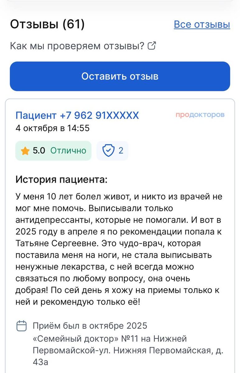 ❗ К сожалению, не всегда успеваю поблагодарить пациентов за их отзывы, появляющиеся на разных ресурсах в интернете. Ну вот сейчас заметила свежий отзыв на сайте Продокторов от пациентки, с которой мы и правда прошли непростой путь к здоровому ЖКТ. Спасибо ей большое, что нашла время написать отзыв. Не устану повторять, что человеческая благодарность - всегда награда для доктора‼