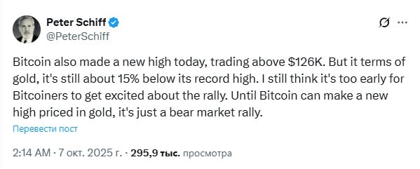 Биткоин также установил новый максимум сегодня, торгуясь выше $126 000. Но если смотреть в пересчёте на золото, он всё ещё примерно на 15% ниже своего рекордного уровня. Я по-прежнему считаю, что биткоинерам рано радоваться этому росту. Пока биткоин не установит новый максимум в ценах на золото, это всего лишь ралли на медвежьем рынке.
