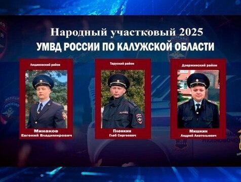 Стартовал 2 этап конкурса на лучшего участкового Калужской области Стартовал 2 этап Всероссийского конкурса "Народный Участковый – 2025" в Калужской области. В финале остались три кандидата: Андрей Мишкин (Дзержинский муниципальный округ), Евгений Минаков (Людиновский муниципальный округ) и Глеб Пленкин (Тарусский муниципальный округ). Один из них станет лучшим участковым и представит регион на федеральном уровне. Отдать голос можно по ссылке, а само голосование продлится до 17 октября, сообщили в УМВД России по Калужской области. http://gtrk-kaluga.ru/news/obschestvo/news-57991