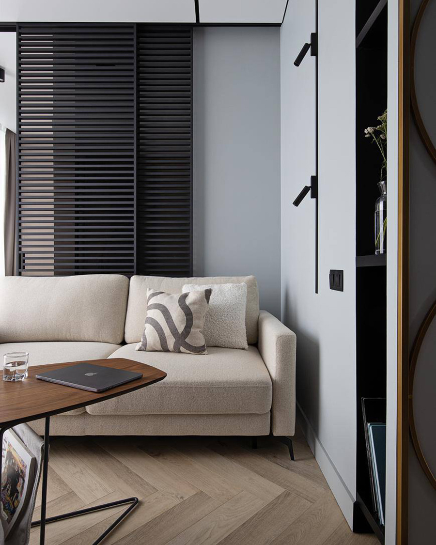 Эта перегородка серии Loft установлена в современном интерьере квартиры, расположенной в Калининграде. Модель Loft 11. Конструкция изготовлена на нашем производстве и представляет собой тонкий алюминиевый каркас с порошковым покрытием в цвете «Антрацит муар». Благодаря этому поверхность имеет благородную матовость и устойчивость к повреждениям. В качестве заполнения использовано прозрачное бронзовое стекло — оно пропускает свет, сохраняя ощущение открытого пространства, и при этом придаёт интерьеру мягкое, тёплое звучание. Перегородка установлена в потолочную нишу, что позволило добиться лаконичного и визуально лёгкого решения без видимых направляющих. Такой приём делает конструкцию частью архитектуры помещения, подчёркивая общий стиль квартиры. Размер: 2938 × 1830 мм.