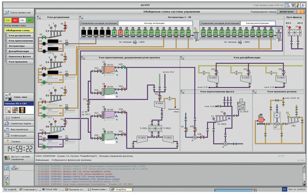 SCADA «eXvision» разрабатывалась для автоматизации разделительного производства урана, однако заложенная при проектировании и реализованная в дальнейшем функциональность позволяют применить SCADA «eXvision» практически для любого – как типового, так и довольно специфичного – технологического процесса. Модульность SCADA «eXvision» предоставляет разработчику механизмы расширения функциональности базовых модулей за счет подключения к ним динамических библиотек и создания в них собственных функций и проверок. Также следует отметить оптимизацию SCADA «eXvision» для проектирования и разработки АСУ ТП, обладающих большим количеством активных элементов на каждой отдельно взятой мнемосхеме и с большим количеством типовых мнемосхем (рис. 1).