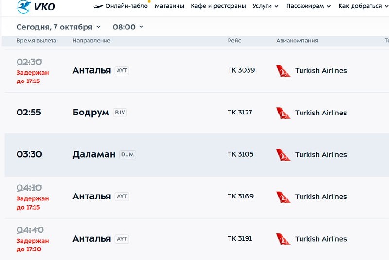 Нам пишут: «В аэропорту Внуково творится коллапс. Turkish Airlines отменила сразу несколько ночных рейсов – якобы объединили их с дневными. И сотни людей теперь не знают, что делать». Действительно, перевозчик перенес вылет сразу пяти бортов. Самая большая задержка у ТК-3051 и ТК-212 – 16 часов, они улетят сегодня не ранее 17:20. Меньше всего придется ждать пассажирам ТК-3191 – вместо 04:40 должен отправиться в 17:30. Все дело в том, что накануне вечером из Антальи в российскую столицу не вылетели пять самолетов. В представительстве перевозчика в Москве пояснить, почему это произошло, не смогли. А пассажирам на турецком курорте представили разные версии: одним сказали, что не принимает Внуково, а другим сообщили о проблемах с электричеством в анталийском аэропорту. Подробнее написали на ТурДоме. @tourdom