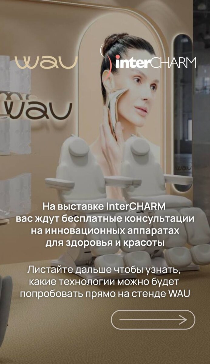 Главное событие года в мире красоты и бизнеса России — InterCHARM 2025 уже совсем близко! ⭐️С 15 по 18 октября в Москве вас ждет выставка, которую нельзя пропустить. Помимо насыщенной программы, у вас будет уникальная возможность бесплатно получить консультации экспертов бренда WAU. Мы подготовили 8 карточек с подробной информацией о том, что вас ждет. Ждем вас у нашего стенда: павильон 3, зал 13, стенд Е12. Запишитесь на консультации с нашими экспертами заранее — количество мест ограничено. За несколько дней с вами свяжется менеджер для подтверждения записи.
