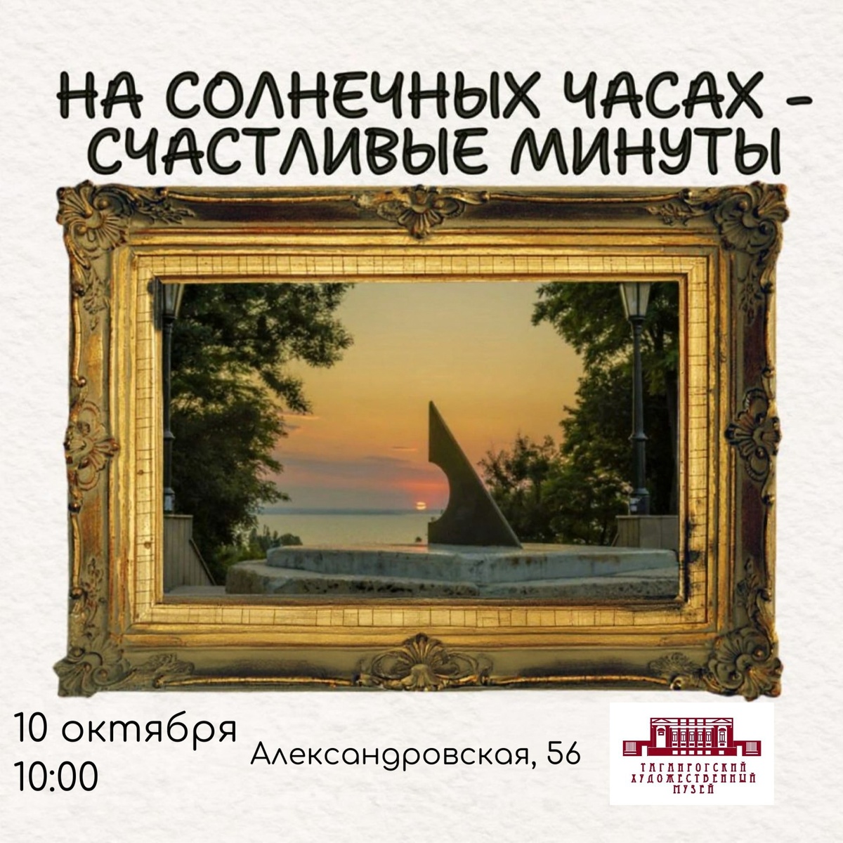 Уважаемые жители и гости города! Уже и на наших солнечных часах октябрь. Давайте же не будем терять времени! Превратим этот месяц в самые счастливые минуты (часы!) вашей жизни с Таганрогским художественным музеем, посетив наши пешеходные экскурсии! Счастье стартует 10 октября в 10 утра от дверей нашего музея по адресу: улица Александровская, 56. Запись и справки по телефону: 89185313666
