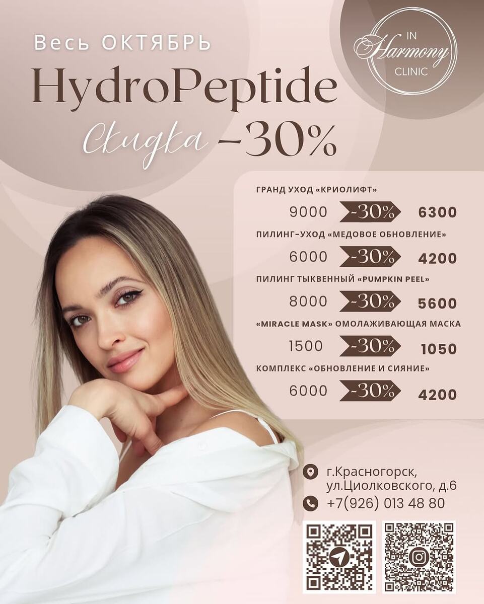 Весь октябрь скидка -30% на уходовые процедуры на косметике HydroPeptide!🔥