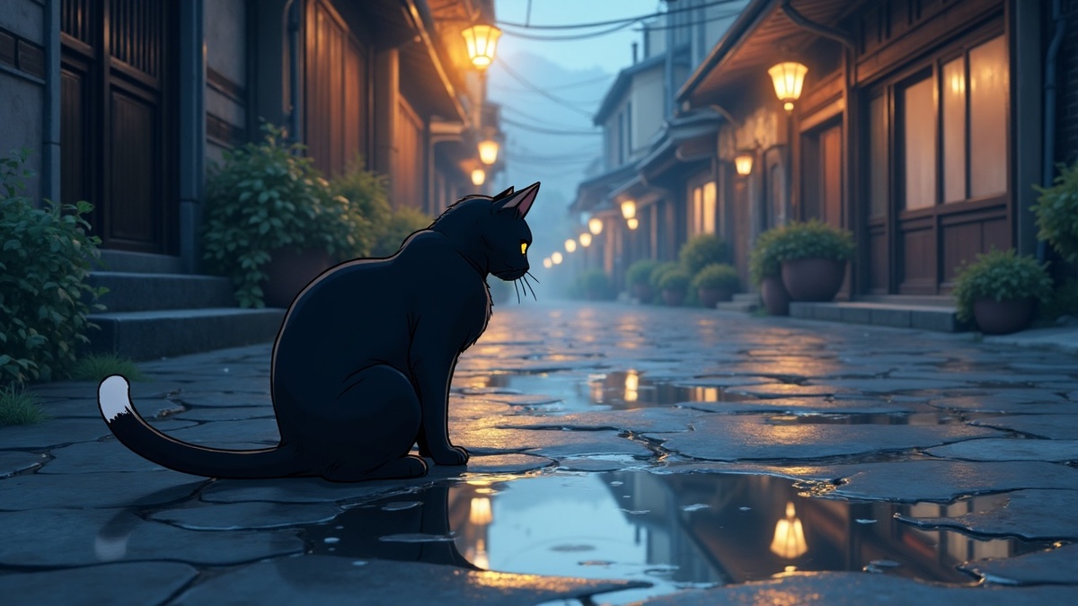 Со временем кошка и сама поверила, что приносит несчастье. Она даже забыла, что у её хвоста — белый кончик. Однажды осенью, сидя у рыбной лавки, кошка грустно смотрела на своё отражение в луже. И вдруг прямо перед ней упал кусочек свежей рыбки. — Неужели сегодня рыба падает с неба? — удивилась кошка и подняла глаза. Перед ней стоял мальчик — с доброй улыбкой и глазами цвета неба. Кошка насторожилась и зашипела: