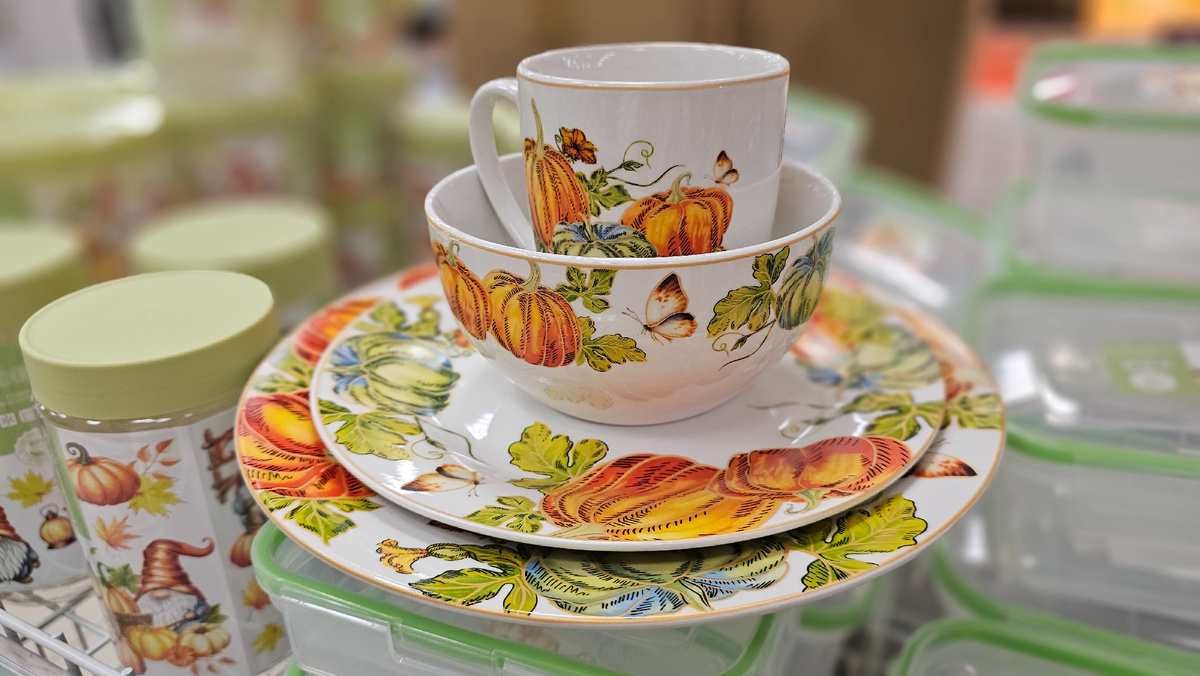 Осенние краски в новой коллекции посуды в магазинах В1 или Первый выбор. Такие яркие и нарядные, можно собрать целый сервиз 🤔 Цены на посуду - от 199р Кружки, пиалы или салатники, пирожковые и обеденные тарелки. Керамика, Китай. Яркий принт с матовой золотистой окантовкой. Слева -поменьше тарелка, справа - побольше которая. Прямоугольные и круглые жаропрочные формы для запекания из опалового стекла, по 399р Герметичные пластиковые контейнеры И банки для сыпучих продуктов, тоже пластиковые, с завинчивающимися крышками Много посуды и для приготовления еды: сковородки, сотейники, жаровни и поддоны с антипригарным покрытием. Стеклянная серия из закаленного стекла, с янтарными ручками Чайник 499р и кружки по 199р И кружки с интересным притом, который виден изнутри и снаружи, Гусь Хрустальный, по 99р. Стеганые ромбами пледы, синтетика, 1299р и декоративные квадратные подушки в цвет, по 299р Домашние тапочки для всей семьи Подушки с котами, квадратные, и круглые, игр
