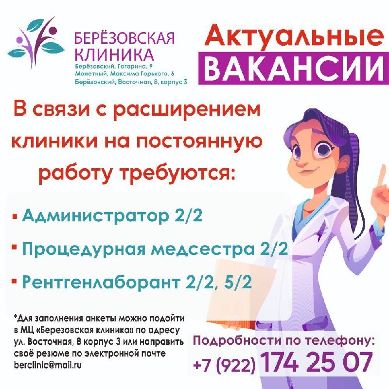 βοΈΠΎΡΠΏΡΠ°Π²ΠΈΡΡ ΡΠ΅Π·ΡΠΌΠ΅ Π½Π° ΠΏΠΎΡΡΡ berclinic@mail.ru Ρ ΡΠ΅ΠΌΠΎΠΉ ΠΏΠΈΡΡΠΌΠ° Β«ΠΠ°ΠΊΠ°Π½ΡΠΈΡ: [Π½Π°Π·Π²Π°Π½ΠΈΠ΅ Π΄ΠΎΠ»ΠΆΠ½ΠΎΡΡΠΈ]Β»,