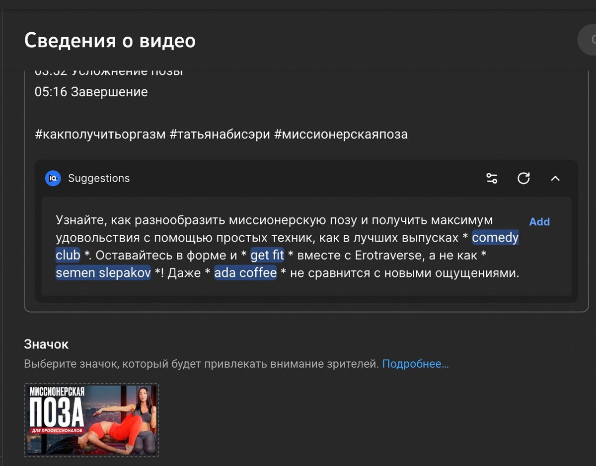 ИИ с юмором Готовлю новое видео на канал клиентов, кстати, который просто полетел в космос по просмотрам и подписчикам, и посмотрите как ИИ предлагаем сделать описание для видео 😄 Вообще это канал про фитнес- Камасутру, но тут он приплел и камеди клаб и Семена Слепакова и даже Аду кофе (кто ее знает? Я знаю))😅 Вот и доверяйте ИИ после этого)) Я лично постоянно пользуюсь ИИ, но всегда правлю Как в вас дела с искусственным интеллектом? П.С. Но названия ИИ предлагает прекрасные. Часто использую, но не на этом канале.