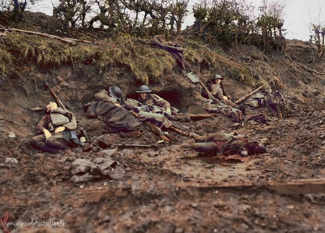 Уставшие и раненые австралийские солдаты отдыхают на железнодорожном полотне рядом с павшими солдатами на хребте Брудсейнде, 12 октября 1917 года.