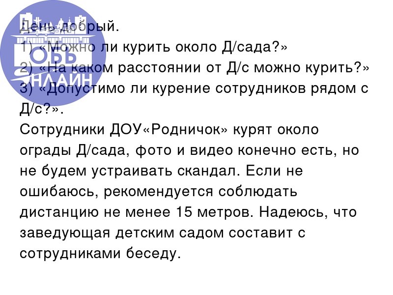 ↗ День добрый. 1) «Можно ли курить около Д/сада?» 2) «На каком расстоянии от Д/с можно курить?» 3) «Допустимо ли курение сотрудников рядом с Д/с?». Сотрудники ДОУ«Родничок» курят около ограды Д/сада, фото и видео конечно есть, но не будем устраивать скандал. Если не ошибаюсь, рекомендуется соблюдать дистанцию не менее 15 метров. Надеюсь, что заведующая детским садом составит с сотрудниками беседу. Это же Детский сад, ну очень некрасиво, можно же подальше отойти. Важно подавать положительный пример и заботиться о создании здоровой атмосферы вокруг детского учреждения. vk.ru Подробнее на https://vk.com/ob.gorod #городобь #городобьонлайн #толмачево