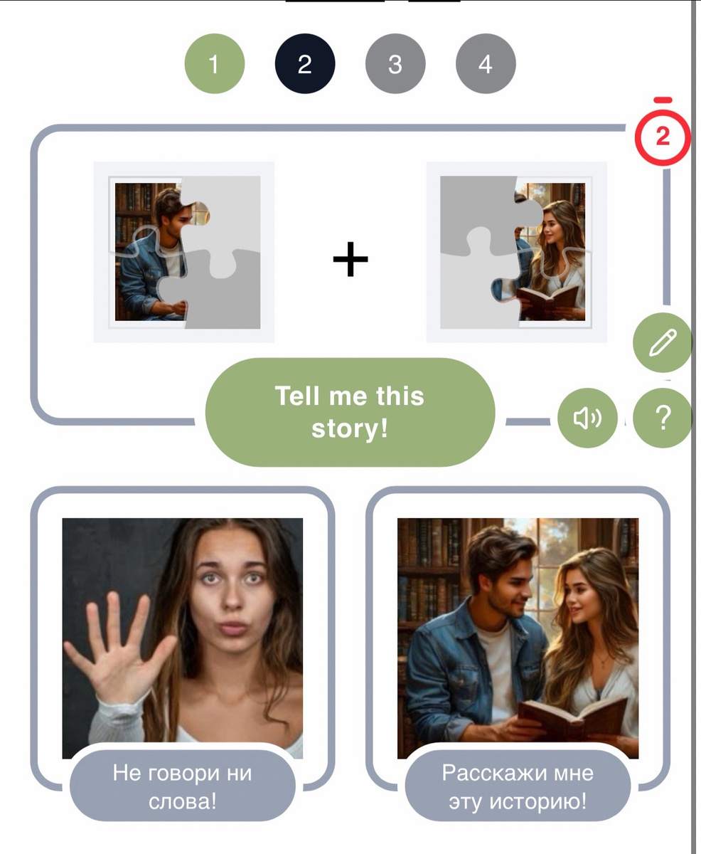 Основные значения этих двух глаголов - «to say» и «to tell» - похожи друг на друга, на мой взгляд, настолько, насколько два русских слова «сказать» и «рассказать» похожи друг на друга по внешним признакам, а именно, написанием и произношением. И они же, «сказать» и «рассказать», конечно же, и по содержанию похожи друг на друга, и поэтому очень часто используются для перевода «to say» и «to tell» на русский язык. Вот два предложения, ставшие основой для соответствующего урока во фразовом онлайн тренажере Parrylingo, развитием которого я занимаюсь, чтобы продолжать изучать английский, и вспоминать, под настроение, то, что когда-то, во время учебы в университете освоил из французского языка. Первое предложение, которое показано на скриншоте урока: «Tell me this story!» («Расскажи мне эту историю!», - обращается молодой человек к девушке, которая, можно предположить, уже прочитала книгу, раскрытую перед ними). Второе предложение этого урока - «Don’t say a word!» появится только на сле