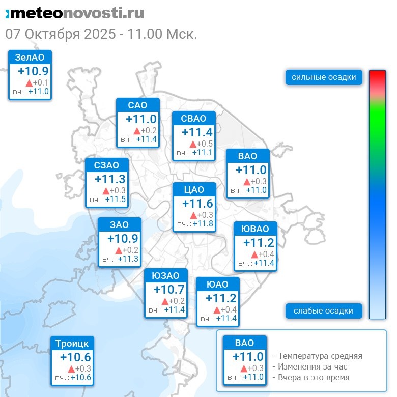 В 11:00 в Москве было от +10.2°C до +12°C, средняя температура +11.2°C #погода #Москва #осень #температура #7октября #вторник Перейти на сайт Прогноз погоды на 14 дней