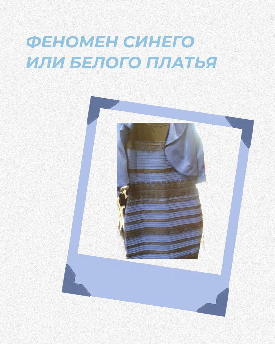 Знаменитый феномен — «платье, которое меняет цвет» стал вирусным именно потому, что люди видят его по-разному: одни — синим с чёрным, другие — белым с золотым. Причина в особенностях восприятия цвета нашим мозгом. Вот как это работает👇 ▶️Если мозг предполагает, что фото снято на солнечном свете (с холодным голубоватым оттенком), он убирает синий из восприятия. В результате платье кажется белым и золотым. ▶️Если мозг считает, что освещение тёплое, искусственное (желтоватое), он компенсирует жёлтый, и платье выглядит синим и чёрным. 🎨 Как одно и то же платье может быть и белым с золотым, и синим с чёрным? Этот знаменитый интернет-феномен — отличный пример того, как наш мозг достраивает реальность. Глаза просто передают световые сигналы, а мозг решает, что мы видим — исходя из опыта, освещения и контекста. 🧠 Одни люди “предполагают”, что платье находится в тени — и мозг убирает синеву, делая ткань белой и золотой. Другие видят фото как сделанное при тёплом свете, и мозг компенси