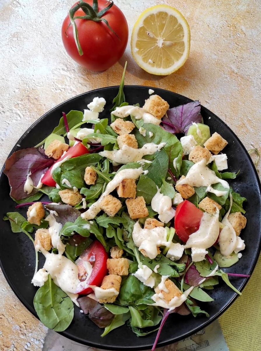 Сегодня у меня рецепт салата с сыром и сухариками, который готовить одно удовольствие. А главное быстро и вкусно. смесь молодых листьев (шпинат, руккола, свекольная ботва) 1 небольшой огурец около 50 гр. сыра фета половина помидора сухарики или подсушенный пшеничный хлеб кубиками на горячей сковороде без масла 3 столовые ложки майонеза 1 чайная ложка острой горчицы (при желании можно использовать и неострую) 3/4 чайной ложки гранулированного чеснока около 1 чайной ложки лимонного сока соль и свежемолотый перец по вкусу В миске смешайте ингредиенты для соуса: майонез, горчицу, чайную ложку лимонного сока и специи. Попробуйте и приправьте по вкусу и/или добавьте больше лимонного сока (по желанию). Выложите на тарелку молодые листья салата, очищенный и нарезанный огурец, нарезанную кубиками фету и помидоры, посыпьте сухариками. Залейте все густым соусом. перед подачей слегка приправьте салат свежемолотым черным перцем можно добавить в салат ветчину, отварную или жареную куриную грудку, с