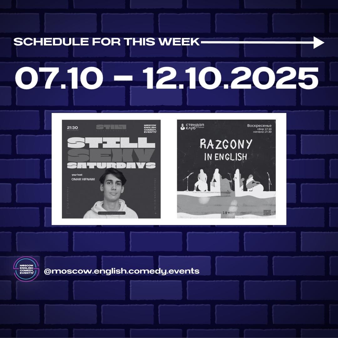 Schedule for this week (07.10 – 12.10)❗️ -----‐----------------------- 🕤Saturday, October 11th, 9:30 PM – Still Sexy Saturdays 🎤Open Mic 🎟Entrance: Pay what you want (any paper note or transfer) 💵 🔗 Register for free 🫰 pay upon arrival 📍Still StandUp Moscow 🗺 Pokrovka 17c5, through the arch with the pink lights 🏙 Blue building directly inside the courtyard -----‐----------------------- 🕠Sunday, October 12th, 5:30 PM - Razgony in English 🍿Panel of comics riffs off each other's jokes and ideas 🎟️Entrance: FREE 💸 Food/drink purchase required 🥗 donations welcome 🔗Reserve for free 📍Stand Up Club на Трубной 🗺 Map: Rozhdestvensky Blvd, 10/7 С1