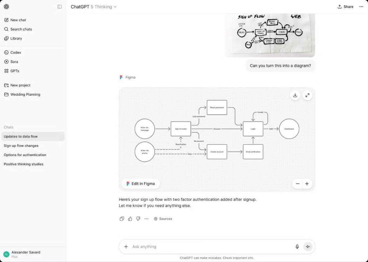 ChatGPT превращается в швейцарский нож: Spotify, Canva и другие теперь в одном чате Сэм Альтман решил, что просто болтать с нейросетью — это уже прошлый век. ChatGPT интегрировал в себя приложения Spotify, Canva, Figma, Coursera. 1) Spotify Бесплатные пользователи смогут рыться в готовых плейлистах вроде Discover Weekly и New Music Friday, а премиум-юзеры смогут получить персонализированные плейлисты, созданные по самым странным запросам. Как это работает: 1. Запускаете чат в ChatGPT, упоминаете Spotify в промпте, и вуаля: вас попросят связать аккаунты. 2. Дальше можете попросить нужные треки, исполнителей, альбомы, плейлисты или подкасты — ChatGPT сам откроет Spotify прямо в чате и подберёт то, что нужно. 3. При нажатии на трек откроется приложение Spotify, позволяющее слушать и смотреть его оттуда. 2) Canva Приложение Canva в ChatGPT позволит создавать, просматривать и редактировать дизайны прямо из интерфейса чат-бота. Теперь можно будет обратиться к Canva из чат-бота и поп