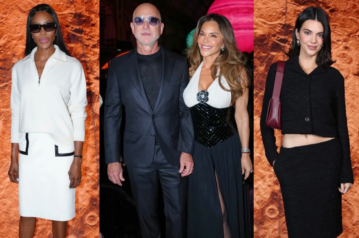 Парижский Grand Palais превратился в планетарий, где звёзды земные собрались под куполом моды. Показ Chanel весна–лето 2026 стал не просто дефиле — это был вечер стиля, уверенности и утончённой силы. Лорен Санчес стала одной из самых обсуждаемых гостей. Её чёрно-белое платье с лакированным корсетом и крупной камелией выглядело ярко, а мини-сумка, украшенная жемчужными элементами, добавила образу мягкого гламура. Рядом — Джефф Безос в безупречном чёрном костюме: лаконичный, элегантный и подчеркнуто сдержанный. Наоми Кэмпбелл появилась в белом костюме с чёрной окантовкой и пуловере на молнии. Минимализм в чистом виде: каждая линия выверена, а контраст поддержан культовыми туфлями cap-toe. Это была классика Chanel без малейшего усилия. Пенелопа Крус выбрала кожаную куртку, белые брюки и лаконичный клатч. Безупречный французский кэжуал, в котором актриса выглядела расслабленно и уверенно. Однако её природная кинематографичность явно просила большего — немного драмы, немного роскоши. Марг