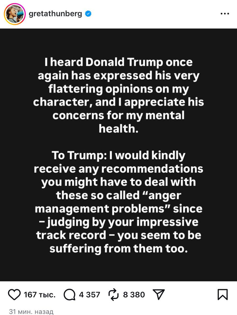 Грета Тунберг в шутку попросила у Трампа совета по лечению проблем с гневом после того, как президент США назвал активистку «злой» и «сумасшедшей». «Я радостно приму любые ваши рекомендации по борьбе с так называемыми проблемами с управлением гневом, потому что, судя по вашей впечатляющей карьере, вы страдаете тем же самым», — написала Тунберг в запрещенном Instagram. Урыла? 👍 БайБайден. Подписаться
