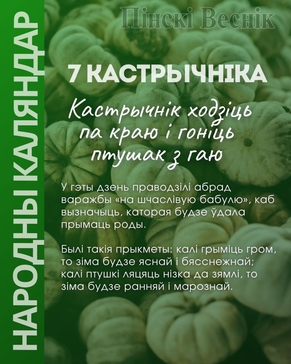 7 кастрычніка У гэты дзень праводзілі абрад варажбы «на шчаслівую бабулю», каб вызначыць, каторая будзе ўдала прымаць роды. Былі такія прыкметы: калі грыміць гром, то зіма будзе яснай і бясснежнай; калі птушкі ляцяць нізка да зямлі, то зіма будзе ранняй і марознай. #народныкаляндар @Пинский Вестник ЮТУБ | САЙТ| ИНСТ | ВК | ОК | ФЕ | Прислать новость