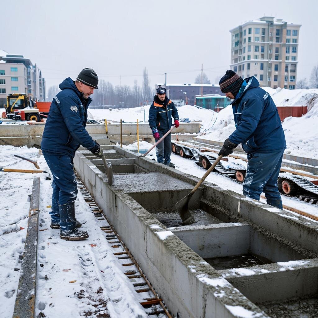 Объективно говоря лучшие условия для бетонных работ – это тёплое время года. И дело не в удобстве, а в технологии. Бетон должен проходить этап полимеризации ("дозревать") при определённой температуре. Если условия не выдержаны материал не наберёт нужную прочность и в недалеком будущем начнёт разрушаться. Но всё же заливать бетон при минусовой температуре (до -5 С по нормам СНиП можно). При этом требуется воспользоваться рядом практических рекомендаций. При минусовой температуре одна из проблем – прерывание и замедление процессов затвердевания бетонной смеси. Значит нужно любым доступным способом температуру строительной смеси повысить. Решения такие: Это позволит ускорить отвердевание залитого вами бетона на своём участке. Речь идёт об утепление залитого бетона плотным, термоизоляционным пологом. При этом использовать электрический подогрев даже не нужно. Бетон не замерзнет. Но есть одно условие – температура воздуха не должна опускаться ниже - 10 градусов. Если мороз перевалил эту отр