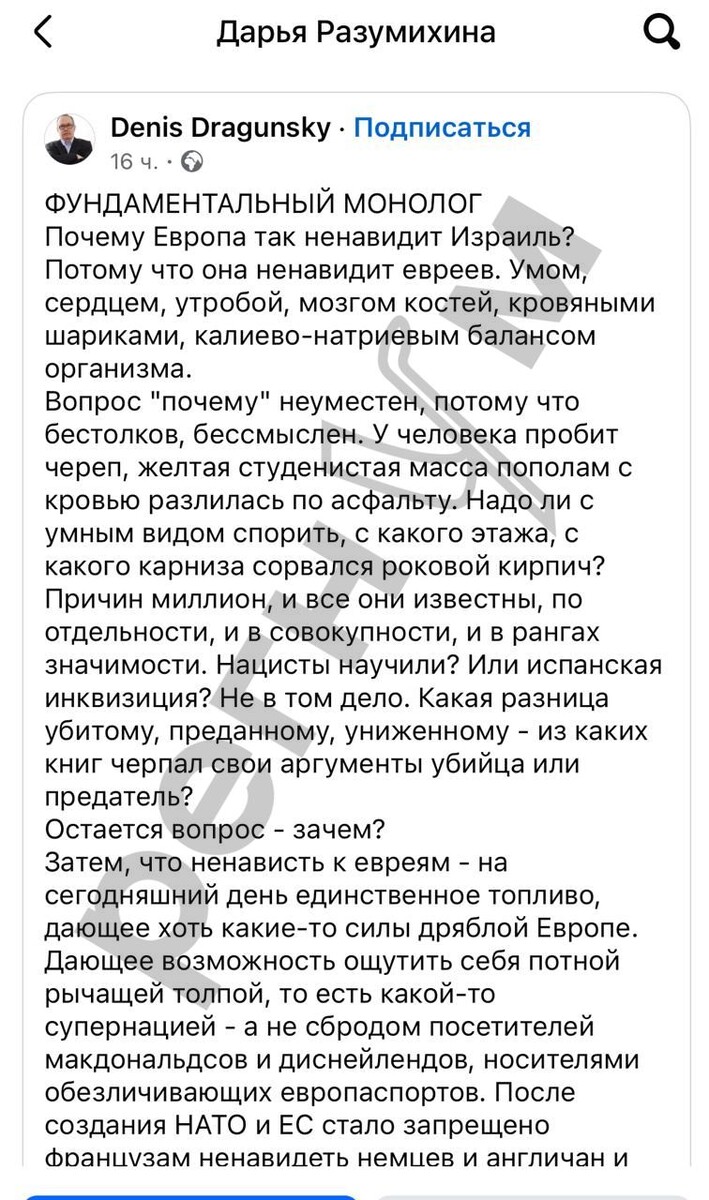 Сын любимого русского детского писателя Виктора Драгунского, автора одной из самых известных книжек для детей "Денискины рассказы" — Денис Драгунский — в очередную годовщину нападения ХАМАС на израильские кибуцы опубликовал у себя в соцсетях пространный пост негатива на тему: «Почему Европа так ненавидит Израиль?»