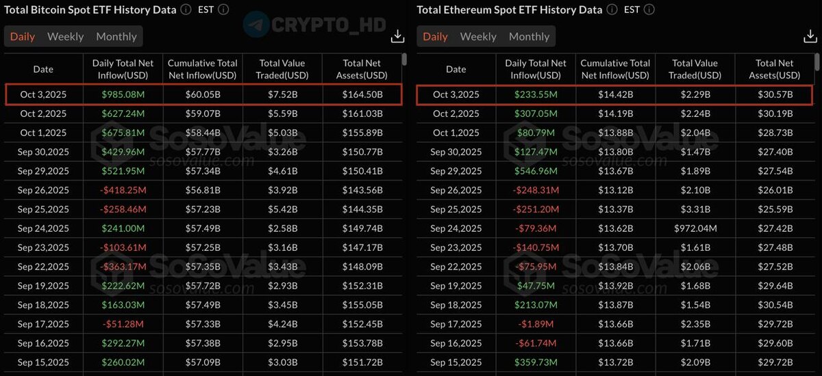 π Π Bitcoin ETF ΡΠΈΡΡΡΠΉ ΠΏΡΠΈΡΠΎΠΊ Π΄Π΅Π½Π΅Π³ Π·Π° Π²ΡΠ΅ΡΠ°ΡΠ½ΠΈΠΉ Π΄Π΅Π½Ρ ΡΠΎΡΡΠ°Π²ΠΈΠ» 985,080,000$ - Π²ΡΠΎΡΠΎΠΉ ΠΏΠΎ Π²Π΅Π»ΠΈΡΠΈΠ½Π΅ Π² ΠΈΡΡΠΎΡΠΈΠΈ (SV) 233,550,000$ - ΠΏΡΠΈΡΠΎΠΊ ΡΡΠ΅Π΄ΡΡΠ² Π² ΡΠΏΠΎΡΠΎΠ²ΡΠ΅ Ethereum ETF (#ETH) Π·Π° Π²ΡΠ΅ΡΠ°ΡΠ½ΠΈΠΉ Π΄Π΅Π½Ρ. Π‘ryptΠΎ Headlines