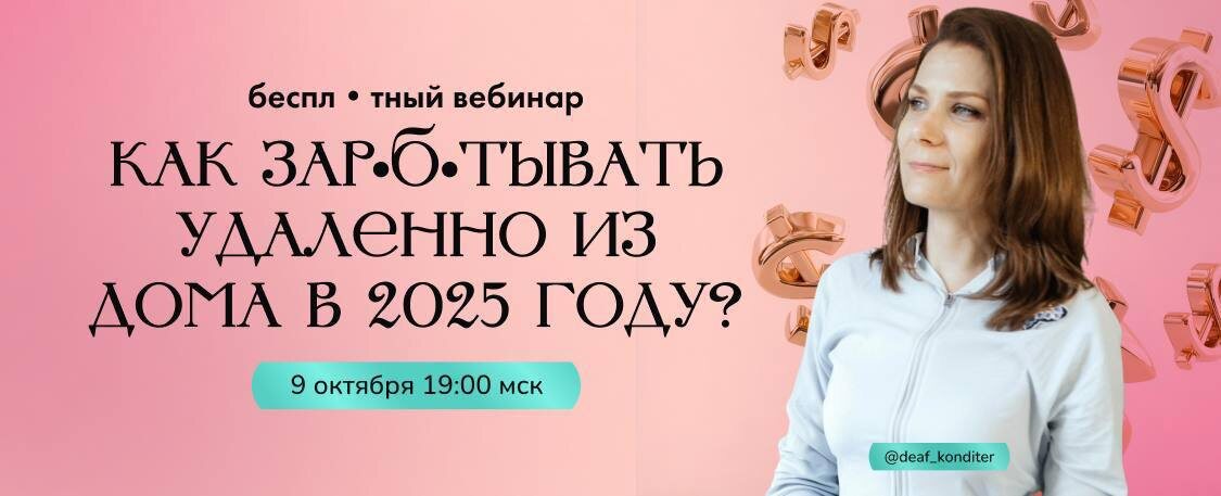 КАК ЗАРАБАТЫВАТЬ ИЗ ДОМА УДАЛЕННО В 2025 ГОДУ?🧐 😍9 октября в 19:00 МСК я проведу новый вебинар, где расскажу: 1. Как глухому уйти на удаленку 2. Ищем клиентов/заказы от 30 тыс. ₽/мес 3. Реальные результаты моих учеников 4. Три шага для заработка из дома 5. Лучшие условия на мой новый курс Нажимайте на ссылку ниже, чтобы зарегистрироваться на вебинар и получить в подарок гайд «Как глухому начать работать из дома?»👇🏻 ➡️ ВЕБИНАР ТУТ В этом посте есть большое видео, которое не загрузилось в Дзен. Откройте оригинал поста в телеграме, чтобы его посмотреть