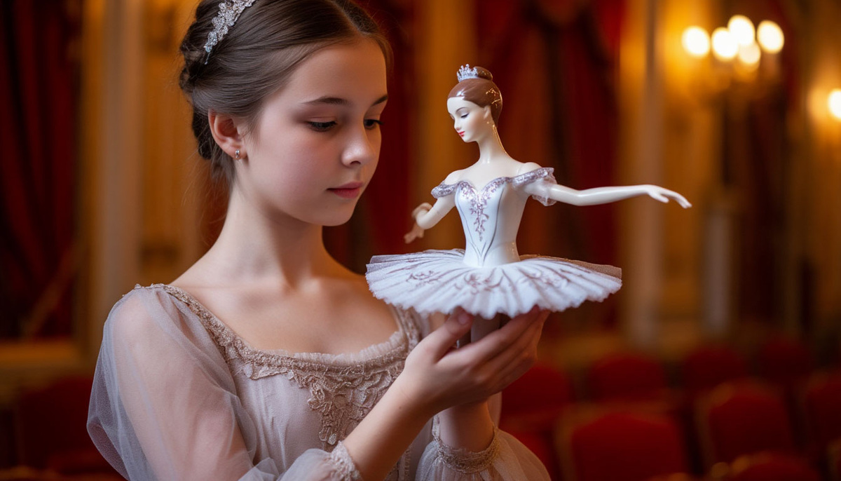 - А вот эта кукла, - он указал на витрину, где стояла прекрасная фарфоровая балерина в белом платье, - особенная. Она сделана по эскизам моей бабушки, которая тоже работала в театре.