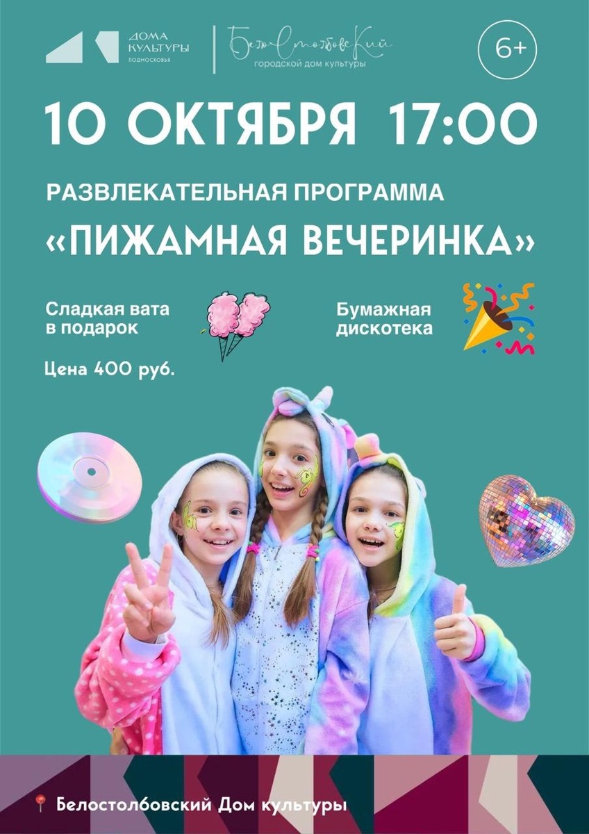 ✨ Приглашаем детей на увлекательную пижамную вечеринку! ✨Вас ждут: 💃 Зажигательные танцы под любимые хиты 🎈Увлекательные игры и конкурсы 🌸Весёлые развлечения в уютной атмосфере 🦄Возможность прийти в пижаме и тапочках 🎉 Бумажная дискотека 🚫 Возраст: 6+ 📆 10.10.2025🕒17:00 🏢 Белостолбовский городской Дом культуры (ГДК) 📍 г.о.Домодедово, мкрн.Белые Cтолбы, ул. Авенариуса стр. 1а 💰 Цена: 400 ₽ ✅ Мероприятия Домодедово https://dzen.ru/id/66f10385cc4c5a16f7b5fb02 http://vk.com/domodedovo_events http://dzen.ru/domodedovo_events