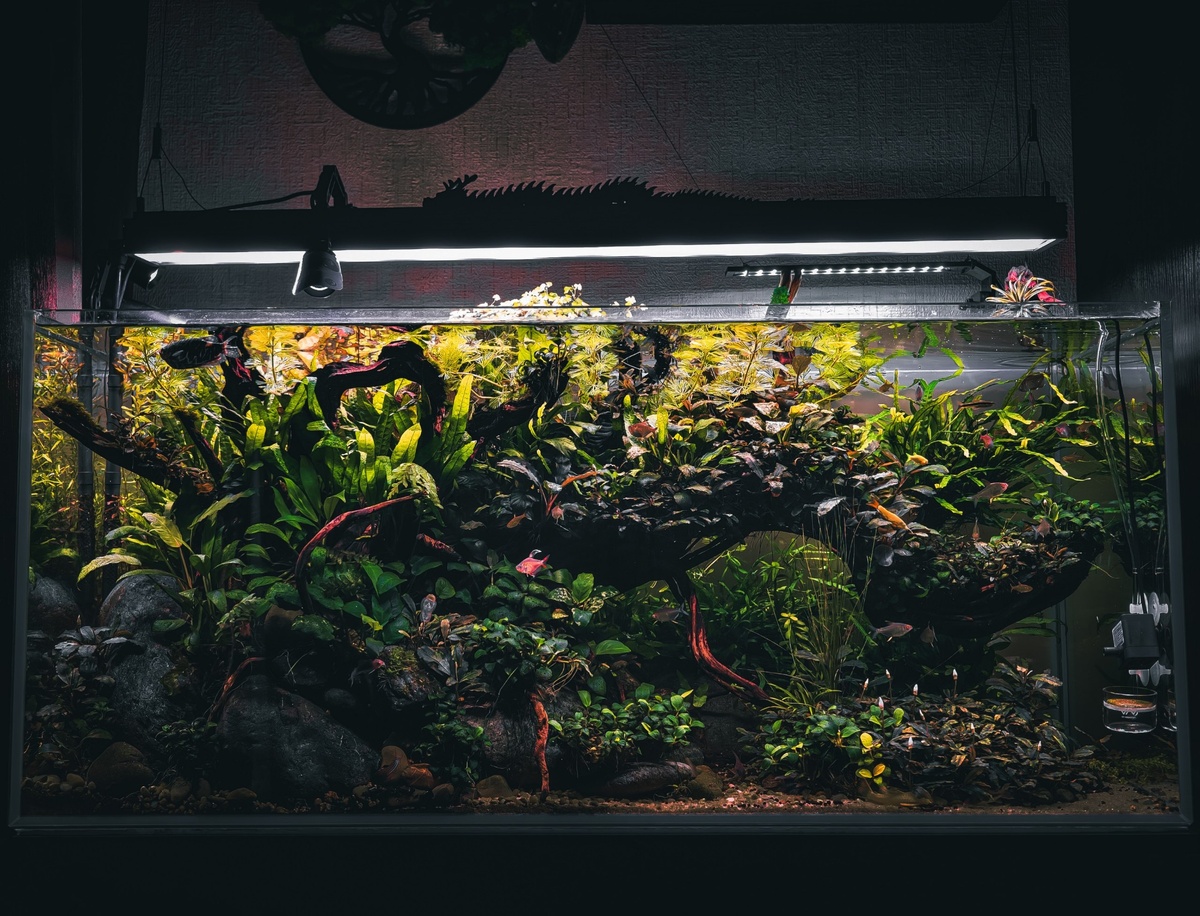 AquaInspiration: От простого к сложному Мой первый аквариум — это воспоминание из начальной школы, когда мир казался огромным, а я маленьким. Прямоугольная банка на 25 литров стояла на письменном столе у окна, без всякого грунта и оборудования, просто с парой гуппи и золотой рыбкой. Они плавали в прозрачной воде, и я мог часами смотреть, как солнечные блики танцуют на стекле. А потом... громадный перерыв длиною в жизнь — работа, переезды, повседневная суета. Но хобби не ушло, оно ждало. Сейчас мое сердце принадлежит стилю «риобоку» — этим загадочным композициям из коряг и камней, где каждый элемент рассказывает историю. Мой главный проект — «Китайский дракон» на 186 литров: извилистая коряга в форме дракона, увитая буцефаландрами и анубиасами, и тихий уголок с таиландским папоротником. Получился настоящий кусочек дикой природы, который шепчет о спокойствии прямо в гостиной. Каждый день его можно изучать и каждый раз залипать в разных частях композиции. Делитесь своими аквариумами —