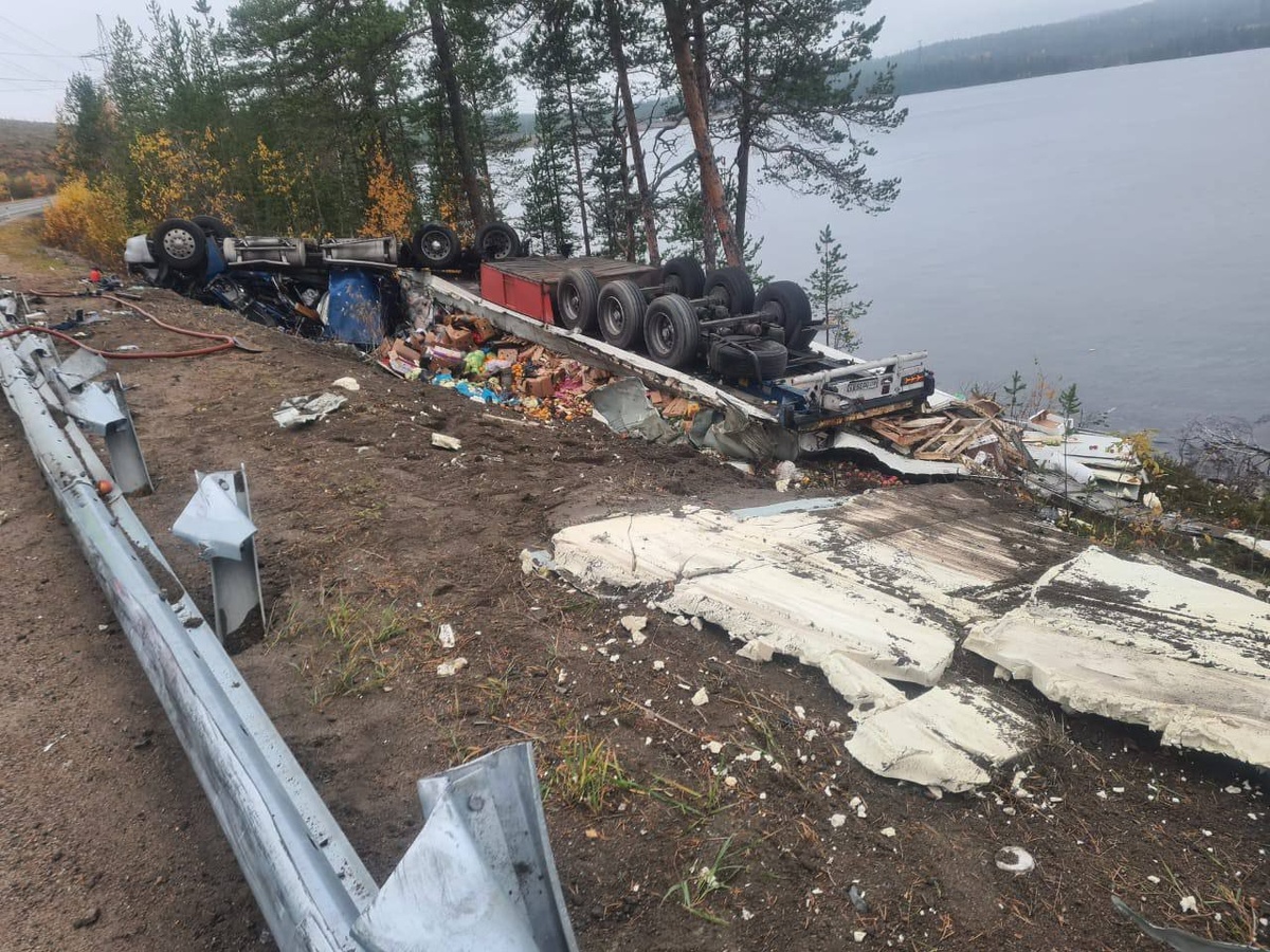 🚛На трассе «Кола» фура влетела в отбойник и легла на крышу: один человек пострадал