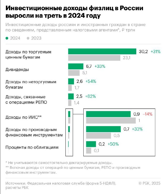 💰 Инвестдоходы россиян растут быстрее, чем зарплаты Такой вывод можно сделать из данных Федеральной налоговой службы, которые приводит РБК. В общей сложности в прошлом году россияне заработали 96,4 трлн рублей. Полученные ими средства можно разделить на две большие группы: 🤩 50 трлн рублей трудовых доходов (к ним относятся зарплаты, премии и другие выплаты, связанные с работой); 🤩 44 трлн рублей инвестиционных доходов (операции с ценными бумагами, дивиденды). При этом вторая группа доходов растёт динамичнее первой: она прибавила 2% год к году, тогда как доля трудовых доходов показала снижение на 2,8%. На инфографике можно посмотреть, какие именно инструменты по приумножению капитала обеспечили россиянам наибольший прирост средств🤩 #Фондовый_рынок #Инвестиции