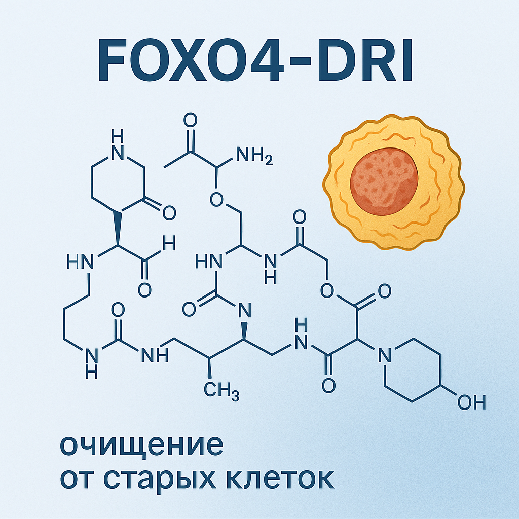 Учёные называют этот процесс inflammaging — хроническое воспаление, которое медленно разрушает тело изнутри. Проблема в том, что такие клетки — живые, но «токсичные». И обычные механизмы организма не всегда умеют их утилизировать. В 2017 году группа учёных из Университета Эразма (Нидерланды) под руководством Питера де Кейзера (Peter de Keizer) представила миру сенсационное открытие — пептид FOXO4-DRI. Изначально команда изучала механизм старения клеток и заметила, что один белок — FOXO4 — удерживает другой, p53, от выполнения своей функции.
