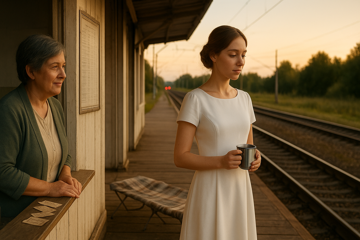 Когда пришёл тот самый день и она надела белое платье — то самое, «на потом», — она ехала с уверенностью, что всё случится просто: он встретит, они пройдут по плите станции, люди улыбнутся, и всё. Но электричка выплюнула её на перрон, и ветер, как всегда, проверил край платья, а он не пришёл. Кассирша Надежда увидела её первой и сразу поняла: сейчас нельзя спрашивать. Она открыла дверцу, как открывают ладонь, и сказала: «Заходи». Марина села и молчала, пока Надежда голосом, отрепетированным десятилетиями объявлений, произносила: «Проход к платформе — направо. Выход в город — налево. Жизнь — по расписанию, но иногда бывают задержки».